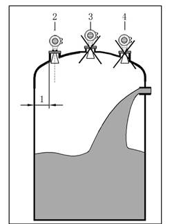 - 喇叭天線必須調整至垂直,不要讓雷達束指向罐壁。