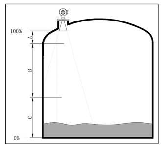 - 若介質為低介電常數當其處于低液位時,罐低可見,此時為保證測量精度,建議將零點定在低高度為C 的位置。