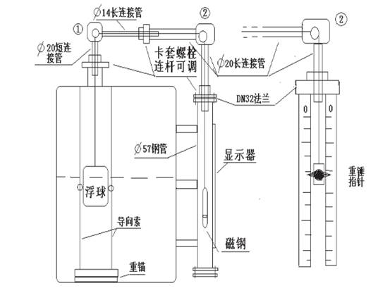 在儀表安裝時,罐內應還未有被測介質,浮標在罐內的底部時,重錘指針部分的紅色尖頭指示應指在標尺測量范圍的頂部“零”值上,否則要調整鋼絲長度。