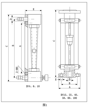 LZB/LZB-( )F流量計的錐管為光滑內壁管(見圖4),通徑DN15以上的流量計,浮子通過導桿 上下移動,保持穩定;LZJ/LZJ-( )F流量計錐管 內壁有三條導向凸筋,使浮子保持穩定(見圖4)。通徑DN10以下的流量計采用軟管連接,配有 針形流量調節閥;通徑DN15以上流量計采用法蘭連接。