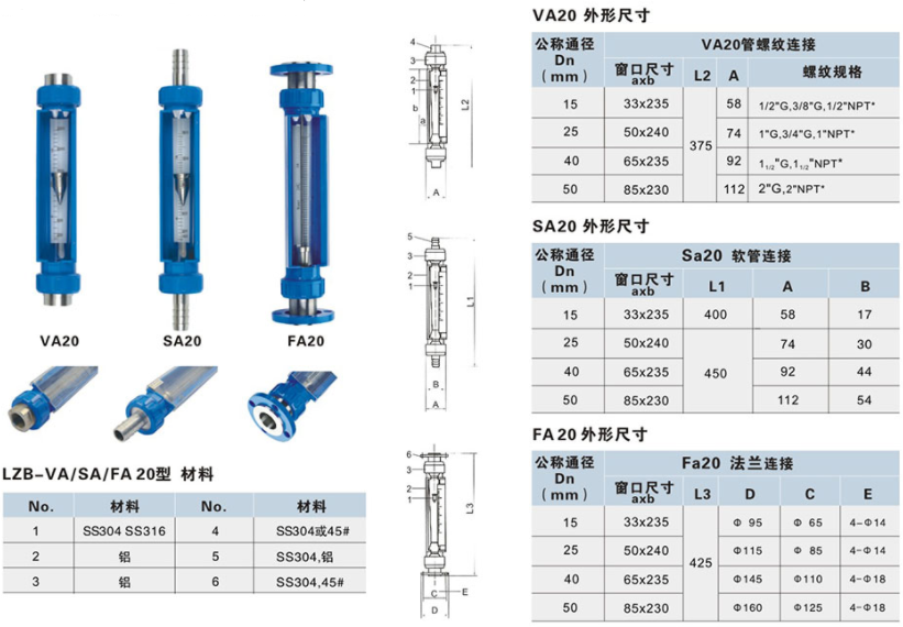LZB-VA/SA/FA20玻璃轉子流量計與同類產品比較具有測量精度高,互換性好,連接方式多等優點?商峁┖撩讟顺;百分標尺;流量標尺和可拆卸的外標度尺,方便不同用戶使用,連接方式有LZB-VA2O管螺紋連接,LZB-SA20軟管連接,LZB-FA20法蘭連接(活套法蘭結構)。
