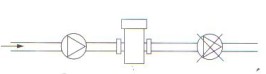 電磁流量計聚四氟乙烯襯里傳感器的安裝 用聚四氟乙烯(PTFE)管材做的電磁流量計的傳感器襯里,它與傳感器測量管管壁一般不粘貼,因此,對真空負壓是敏感的。管道內真空會抽癟聚四氟乙烯襯里,使襯里呈波浪型拱起——典型的負壓破壞形態,這樣破壞了電極的密封,傳感器就不能工作了。因此,PTFE襯里的傳感器不能用于負壓系統,也應盡可能避免安裝在可能產生瞬間負壓的地方。如傳感器不應裝在泵的吸入端;閘閥應裝在傳感器的后側,如圖所示。