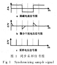 在現行的電磁流量計設計中,低頻矩形波勵磁方式結合了直流勵磁和交流勵磁兩者的優點, 成為主要勵磁方式之一。在低頻勵磁方式下, 其干擾主要表現為: 由勵磁電流突變產生的微分干擾信號[ 1] 。理想勵磁磁場信號為低頻矩形波, 實際上隨著勵磁電流變化 ( dI /dt)在磁場上產生微分干擾信號, 隨著電流的穩定, 干擾信號隨之消失, 因此同步采樣技術可以有效抑制微分干擾信號。實際設計中, 模數轉化器使用 AD 公司的 24位 Sigma Delta模數轉化器 AD7714。 AD7714 可以分別采用硬件和軟件方式進行采樣開始時間控制, 從而實現同步采樣。采用軟件方式時, 當控制寄存器中FSYNC位為邏輯 1時, 模數轉換器處于復位狀態; 向該位寫邏輯 0時, 器件開始采樣輸入信號。在應用中,低頻勵磁信號由 M SP430單片機內部定時器產生, 同時產生采樣信號。如圖 1所示, 采樣開始時間滯后勵磁信號14 個周期。