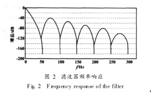 式中: fs為采樣頻率; AD7714采樣頻率為 1912 kHz ; N為濾波采樣個數; f 為數字濾波器響應頻率。通過設定濾波采樣個數可以改變數字濾波器的截止頻率和一次陷波頻率。在本設計中綜合考慮模數轉換速度和去除噪聲性能, 設置 N 值使濾波器截止頻率為 50 Hz, 濾波器頻域響應如圖 2所示, 濾波器對工頻 50 Hz及其偶次諧波有很好的抑制作用。