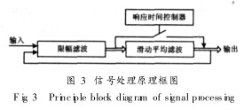 泥漿干擾是在測量泥漿、纖維漿等固液兩相特性液體時, 固體顆;蛘邭馀菖c電極發生摩擦, 在電極表面的電化學電動勢突然變化, 電磁流量計傳感器輸出信號輸出尖峰脈沖狀干擾。在低頻勵磁情況下, 泥漿干擾產生的尖脈沖數量級大, 極大地影響流量的準確測量,在實際設計中,采用多種信號處理混合方式抑制噪聲,信號處理原理如圖 3所示。