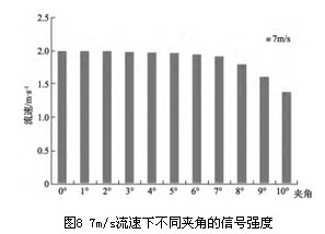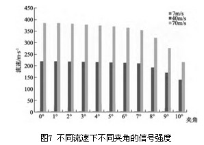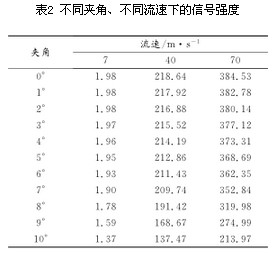 通過仿真模擬,圖4給出流速u=5m/s時,作用在三角柱上的升力系數和阻力系數變化曲線。由圖5升力系數的FFT曲線可以看出其頻率為FL=87.92Hz。從圖6阻力系數的FFT曲線可以看出其頻率為FD=176.43Hz,約為升力系數變化頻率的2倍。 為了驗證將FLUENT用于渦街流量計的三維流場仿真的可行性,對不同流速下的升、阻力頻率進行比較,如表1所示?梢钥闯鲎枇ο禂底兓l率是升力系數變化頻率的2倍,說明用FLUENT進行渦街流量計的三維仿真是可行的。 4 仿真結果 基于上述通過升、阻力變化頻率的關系驗證出利用FLUENT對三維渦街流場進行仿真是可行的。本節應用FLUENT對截流夾角、流速和信號強度之間的關系進行了仿真研究。分別取7m/s、40m/s和70m/s的流速α的角度在0°~10°范圍內取值(發生體的安裝偏差一般不會超過10°),進行數值仿真。記錄信號強度,如表2所示。 將表2的數據繪制成圖7,將圖7中流速為7m/s的數據放大如圖8所示。觀察圖7、8,可以直觀的反應出夾角、流速與信號強度的關系變化。通過對比這3張圖可以看出,信號強度隨著夾角、流速的不同而不同。并從圖中得出結論: 1)渦街的信號強度與流速成正比,隨著流速的增加,旋渦脫落頻率信號強度會顯著增加。 2)在流速相同的情況下,隨著夾角的增大,信號強度逐漸減小,并隨著夾角的增大,信號強度的衰減程度也逐漸增大。夾角在1°~7°范圍,對信號強度的衰減影響不大,可忽略,超過7°以后對信號強度影響變大,不可忽略。 3)在夾角相同的情況下,隨著流速的增大,信號強度衰減趨勢越來越明顯。 5 結論 流場仿真在渦街流量計的設計和完善中正變得越來越重要,它通過理論支持指導仿真的可實施性,并將仿真結論用于實驗中,提高效率。通過模擬三維渦街流場三角柱繞流現象,將升、阻力頻率進行對比,驗證了可將FLUENT用于三維渦街流場的仿真中。并從不同流速和不同截流夾角兩方面分別考慮,對比分析了三維渦街信號的信號強度,得出夾角在1°~7°范圍,對信號強度的影響不大,超過了7°以后影響變大。從而為以后的實驗做出理論指導。進一步的研究可以通過對不同形狀的旋渦發生體取不同截流夾角和不同流速進行仿真對比研究。