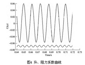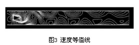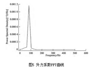 3.2 仿真參數設置 在FLUENT中,三維渦街流場參數設置如下: 1)流體:空氣(air); 2)湍流模型:Renormalization-group(RNG)k-ε模型; 3)邊界條件 ①流速入口邊界:根據需要設置不同流速、湍流動能和耗散率; ②壓力出口邊界:零壓; 4)求解器:基于壓力的三維雙精度瞬態求解器; 5)數值計算過程:SIMPLE算法。 3.3 升、阻力變化頻率的計算結果及分析 圖3所示速度等值。三維渦街流場在夾角為0°,入口流速為5m/s的情況下的速度等值線圖。
