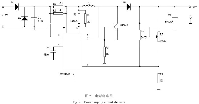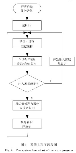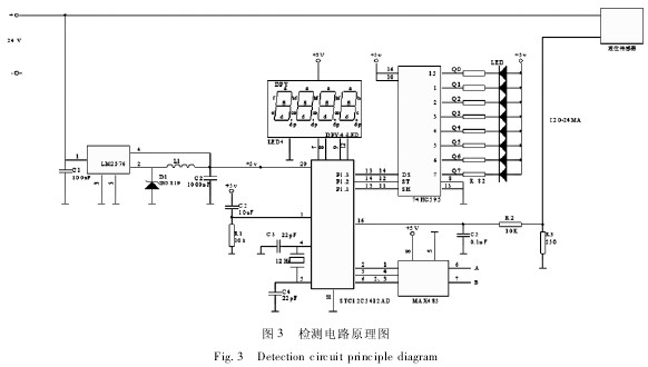 0引言 液位包括液位信號器和連續液位測量兩種。液位信號器是對幾個固定位置的液位進行測量,用于液位的上、下限報警等;連續液位測量是對液位連續地進行測量,廣泛應用于農田灌溉、定量施量、高爐沖渣水位測量、環境監測等農業生產領域,具有非常重要的意義。目前,對液位測量的精度要求不僅愈來愈高,且需要測量儀能夠適應一些特殊環境,如高溫、高壓、強放射性及強腐蝕性等條件。液態肥因其生產費用低、肥效高、易吸收、節支增產效果顯著及施用過程中可以根據需要加入土壤所缺少的植物營養元素等優勢迅速得到了廣泛應用。而變量施肥作為農業的重要部分,其技術基礎就是對液肥液位的準確控制。目前市場上,液位控制系統大致可分為以下兩種: 1)機械式控制系統。機械式控制系統結構簡單、成本低廉;但這種控制裝置故障多、誤動作多,且只能單獨控制,與計算機進行通信較難實現。 2)交流調壓/變頻調速控制系統。該系統是通過安裝在水泵出口管道上的壓力傳感器,把出口壓力變成標準工業電信號的模擬信號,經過前置放大、多路切換、A/D變換成數字信號傳送到單片機,經單片機運算與給定量的比較,進行PID運算,得出調節參量;經由D/A變換給調壓/變頻調速裝置輸入給定端,控制其輸出電壓變化,來調節電機的轉速,以達到控制水位的目的。 本文以液態施肥機為依托,針對一定體積的液肥進行液位試驗,通過以單片機和投入式液位計為主要硬件資源設計硬件電路,畫出相應的軟件流程圖進行測試。數據分析驗證表明:該傳感器在液肥液位測量中安裝維護方便,能適應液肥這種特殊環境,其容量和液位高度的測量誤差也滿足實際要求。 1系統工作原理及組成 微壓式液位計采用的是壓力敏感元件實現力-電轉換。傳感器的液位量程是0~1.3m,且這段量程液位所對應的深度約合壓力相比其他要小很多,因而稱其為“微壓式”。本系統是所選的正是微壓式傳感器,它將液位信號轉換為4~20mA標準電信號輸出。 若設所測液體密度為ρ,液位高度為h,大氣壓為ρ0,重力加速度為g,則液體所受壓力p=ρgh+ρ0。這時,為抵消大氣壓力變化所帶來的測量誤差,傳感器變送器部分采用導氣電纜將大氣壓力ρ0引入敏感元件的負壓腔,進而使p=ρgh。顯然,若已知液體密度,通過測取壓力p就可換算出相應的液位高度。 1.1單片機選型 該系統結構相對簡單、運行速度快,考慮到功能和成本兼顧,采用以擴展性51系列單片機STC12C5412AD為核心控制元件。該芯片具有12kB用戶可自行安排的FLASH及FEPROM空間比例;在同樣的工作頻率下,平均指令運算速度是普通8051的8~12倍[4],滿足系統對數據處理的要求,且掉電模式可由外部中斷喚醒,適用車載信息系統。系統設計方案圖如圖1所 1.2投入式液位計選型 其基于所測液體靜壓與該液體的高度成比例的原理,再將靜壓轉換為電信號,實現非電量到電量的變換,利用這一特性來完成對液位的測量。主要技術參數如下:量程1.3m,精度0.5%Fs,電壓18~36VDC,輸出4~20mA。 其優點包括:①能實時測量罐內各點液位;②直流4~20mA標準電流信號輸出;③密封性好,測量元件不與液肥直接接觸,避免了液肥對元件的腐蝕。 2硬件電路設計 2.1電源電路設計 電源電路圖如圖2所示。圖2中,為了保證液位傳感器能獲得24V的直流供電,選用具有DC-DC單片控制電路功能的MC34063芯片,片內包含有溫度補償帶隙基準源,能輸出1.5A的開關電源,且是使用最少的外接元件構成的升壓變換器、降壓變換器和電源反向器[5]。 本系統電源電路采用具有升壓轉換作用的MC34063芯片,與電感L、二極管D3、三極管TIP122一起構成電源電路。若TIP122導通時,+12V的輸入電壓經采樣限流電阻R1、R2,流經電感L,隨著電感L電流增加,其兩端進行儲存能量。此時,二極管D3是防止電容C3對地放電,并由電容C3向負載供電;若TIP122斷開時,電感L及12V的輸入電壓對電容C3充電的同時電容C3對負載供電,負載電壓穩定在+24V,穩壓的負反饋信號是電阻R7、R8的分壓輸入到MC36063的5腳。 2.2檢測電路設計 硬件部分的核心為STC12C5412AD,工作電壓由LM2576從24V轉變為5V來提供。同時,用MCU的3個輸出引腳P1.1、P1.2、P1.3連接串并轉換芯片74HC595,就可實現對系統所有的顯示功能及顯示元件的控制。圖3中的74HC595芯片Q0~Q7共8位輸出控制8個發光二極管,每個二極管分為閃、亮2段,共16段,通過燈的閃亮和4個數碼管顯示的罐內液體容積值來記錄相關液位數據。其檢測電路原理圖如圖3所示。 3系統軟件設計 系統軟件是利用51系列單片機集成開發工具來進行C語言設計,采用模塊化設計方式,由系統與監控程序一起管理執行。系統軟件主要由主程序、初始化程序、定時中斷處理程序組成。其中,系統主程序包括A/D轉換子程序及顯示子程序。系統初始化后進入主循環,定時中斷處理程序是對74HC595的輸出進行控制。系統主程序流程如圖4所示。 4數據測試及分析 4.1測試條件 為驗證本設計的可行性,基于所測液體靜壓與該液體的高度成比例,再將靜壓轉換為電壓的試驗原理,搭建實際的電路。用現有的播種機儲液罐作為容器可容納近1000L的液體。其實際測量高度如圖5所示。因液肥與水密度相近,所以用水作為測試對象,在正式用液肥時驗證誤差,算出修正系數,再寫入單片機中進行校正。 首先將液位計正確安裝于儲液罐底部,接通電源后利用串有流量計的電泵開始注水,注意觀察液