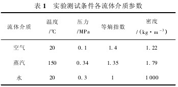 為驗證仿真分析得到的結論,利用負壓法音速噴嘴氣體流量計量標準裝置、蒸汽實流計量標準裝置和水流量計量標準裝置對該結構類型的渦街流量計進行三種介質的實驗研究,各測試條件參數如表 1 所示。