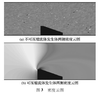 由圖 3 可以看出,不可壓縮流體的密度在仿真過程中沒有發生變化,可壓縮流體的密度發生了變化,必然會導致兩側速度 U1的變化?蓧嚎s流體經過發生體后密度變小會導致 U1變大。