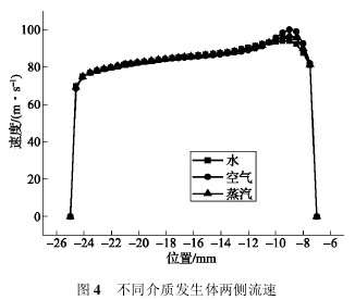 根據圖 3 得到的結論,對渦街流量計進行蒸汽、空氣和水三種介質下的軟件仿真,設置三種介質的入口流速均為 50 m/s,取渦街發生體迎流面側棱中點與管壁連線,如圖 2 中線段 ab所示。取該線上的速度值,將蒸汽、空氣和水三種介質下的速度曲線進行比較,結果如圖 4所示。